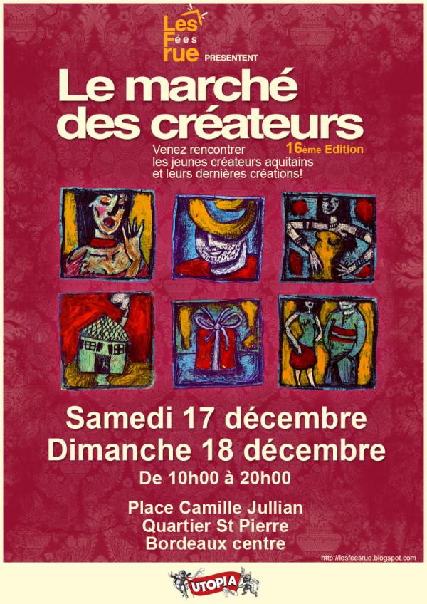 Durant le frileux, mais au combien festif, mois de décembre, la place Camille Jullian de Bordeaux va prendre des allures de Noël pour un week-end. Samedi 17 et dimanche 18 décembre 2011 de 10h à 19h, l’association Les Fées Rue met en vedette le talent de quarante créateurs de la région.Emmitouflés et le cœur en joie, venez flâner dans les allées bordées de stands colorés. Vous y trouverez des collections originales !