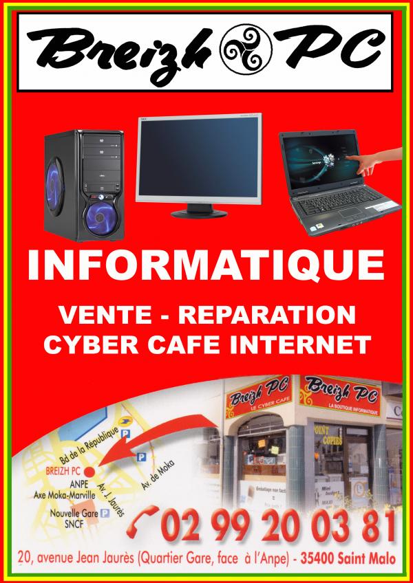 A quelques mètres de la gare, dans une ambiance décontractée et conviviale, vous pourrez jouer en réseau, accéder à Internet, tchater sur MSN ou réaliser différents travaux de bureautique, de création de document (CV, menu), de reliure ou de plastification, des copies laser A4 et A3 couleur ou la duplication de VHS et Super 8 sur DVD.Pour encore plus de services, l’équipe de Breizh PC vous accueille dans leur sympathique magasin dédié à l’informatique. Ici, vous trouverez tout ce qu’il vous manque, PC neuf ou d’occasion, à des prix défiant toute concurrence. Dans ce magasin dont la devise est «Mini-budget – Maxi-services», les techniciens réparent sur place avec beaucoup de rapidité et d’efficacité. N’hésitez pas à demander conseil à ces professionnels.