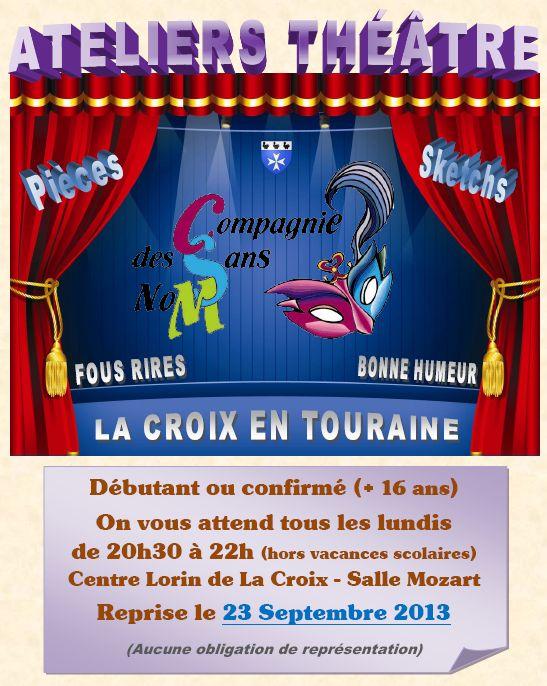 Ateliers théatre le lundi hors période scolaire à partir de 20h30 au centre lorin de la croix en touraine 2 essais puis 40 euro à l'année . Lieu : - Salle des fêtes de La Croix en Touraine, en salle et sur scène Horaires : - Lundi de 20h30 à 22h00 hors vacances scolaires Effectif moyen : - De 12 à 20 personnes dans une ambiance conviviale et sympatique - Adhésion à tout moment de l'année : intégration facilitée Tarifs : - Adhésion 5€/an - Annuel : 35€/an (25€ pour les 14-18ans) - Chèques vacances et passeports loisirs jeunes acceptés Particularités : - Atelier mixte parent-enfant une à deux fois l'an - Création de sketchs pour les personnes intéressées dans le cadre de représentations, scènes ouvertes, festival