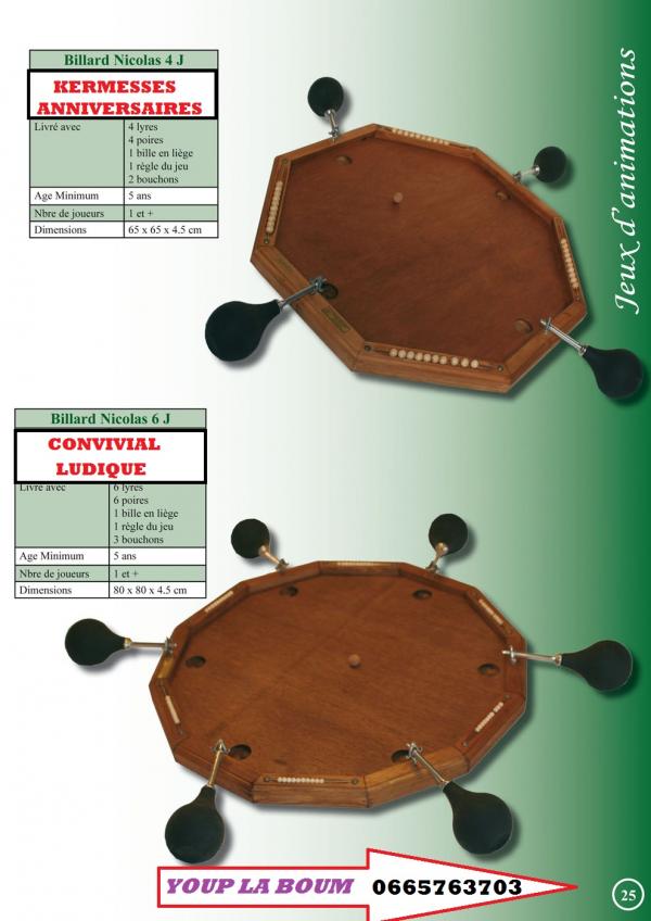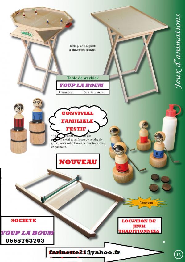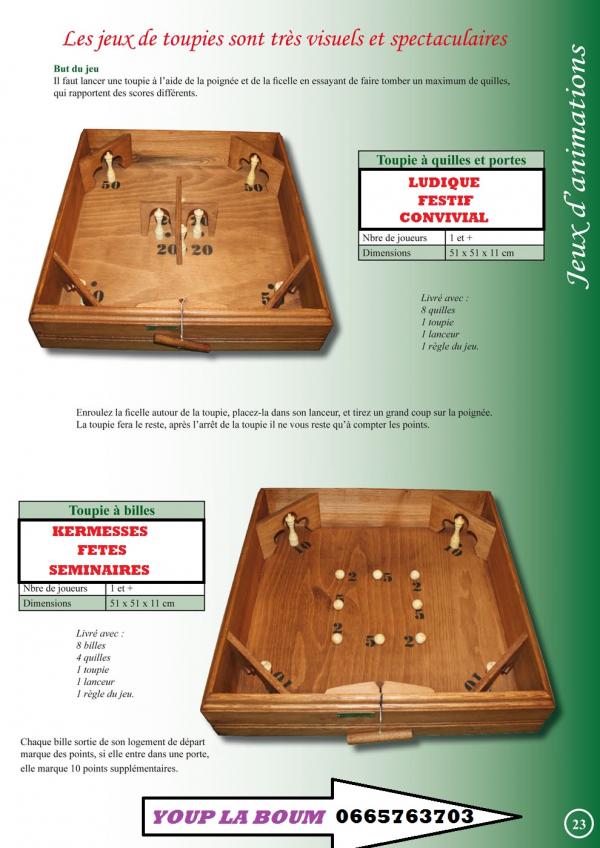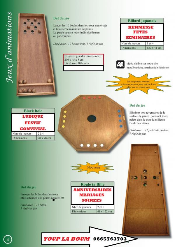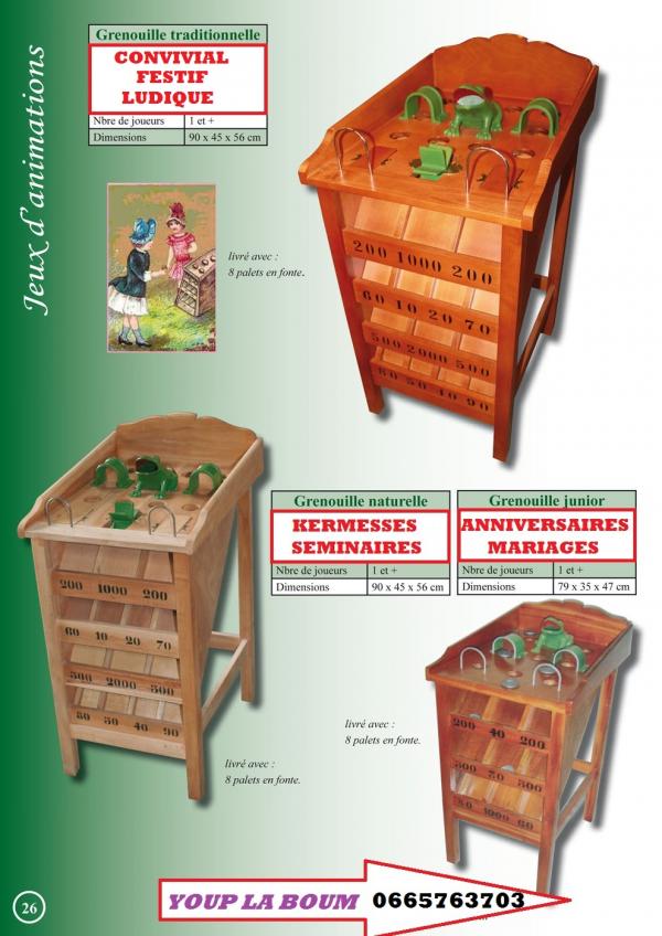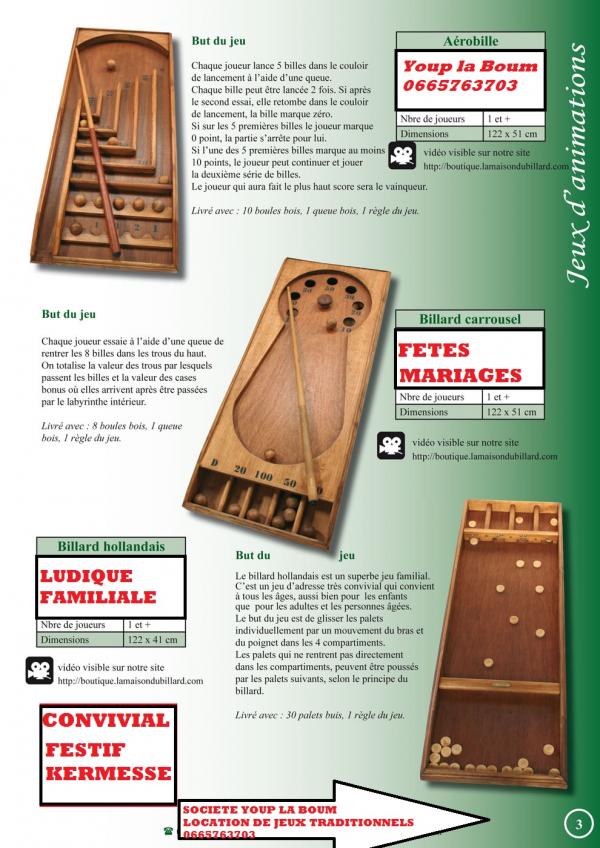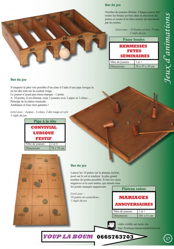 Madame , Monsieur . Dans le but d'offrir un lien social , interculturel , intergénérationnel pour mieux vivre ensemble à toutes les générations de l'école primaire à la maison de retraite je propose aujourd'hui (auto entrepreneur) ma société de location de jeux traditionnels en bois , des jeux qui ont traversé les générations voir les siècles , ils sont d'inspiration traditionnelle de fabrication haut de gamme par des menuisiers ébénistes , conformes au normes européennes CE . ils sont à la fois ludique, attractifs , festifs pour animer vos évènements (fêtes de village , kermesses , mariages , soirée à thème (loto , tarots soupé dansant , animations ponctuelles etc. . . ) . pour les clubs de sport pour vos soirée loto , tarots , souper dansant , tournois , challenges ou pour une journée , soirée amicale entre joueurs et familles (ambiance garanti). Ma prestation clef en main propose : -installation des jeux . -explications des règles ( très simples) . -démonstration des différents jeux loués . -éventuellement accompagnement des participants. -récupération et rangement des jeux le soir ou le lendemain de la manifestation. Je me tiens à votre disposition pour plus de détails et vous serait infiniment reconnaissant de bien vouloir me donner votre avis concernant le service que je propose ( cela dans le but de rassurer les associations et organismes