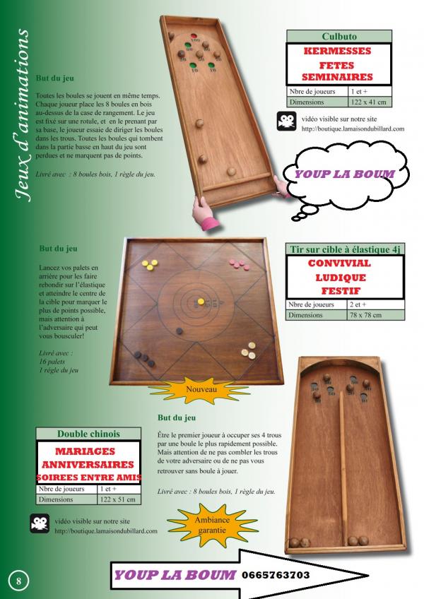 Activité basée sur l'aspect festif d'une soirée. le client est livré à la date convenue. les jeux sont de fabrication Française ( par des ébénistes )ils sont aux normes de sécurité Européenne .