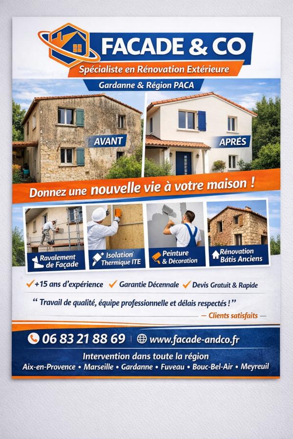 Façade & Co, entreprise de Gardanne avec plus de 15 ans d'expérience dans le bâtiment, est là pour tous vos travaux de façade, rénovation et construction. Qualité et professionnalisme garantis !
