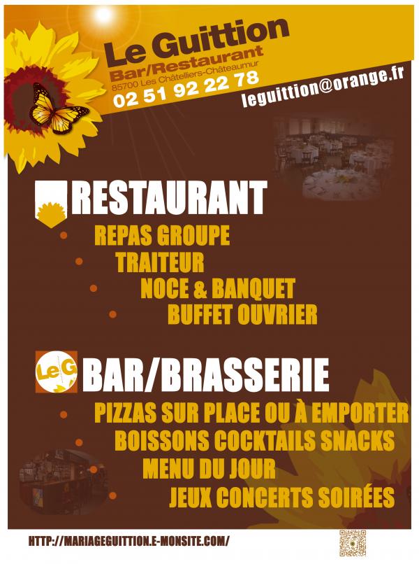 Son bar: Ouvert 7/7, de 9h30 à 21h en semaine et de 10h à 2h le week end. Son service bistro avec sa formule à 11€ le midi en semaine, ainsi que son service pizza, agrémenté de son petit coin salon pour les moments entre amis. Un patio est à votre disposition pour les fumeurs ou pour les déjeuners et dîners au soleil. Toilette aux normes handicapés. wifi gratuit. Ses salles de réception de 30 à 250 couverts : Repas de famille, banquet, noce, repas d’entreprise, le week end et en semaine le Guittion s’adapte à vos besoins, dans ces trois salles modulables de plein pied, bordées d’un parking privé de 300 places. Le Guittion s’adapte à vos envies de restauration ; buffet, repas classique, lunch et toute autre soirée à thème.